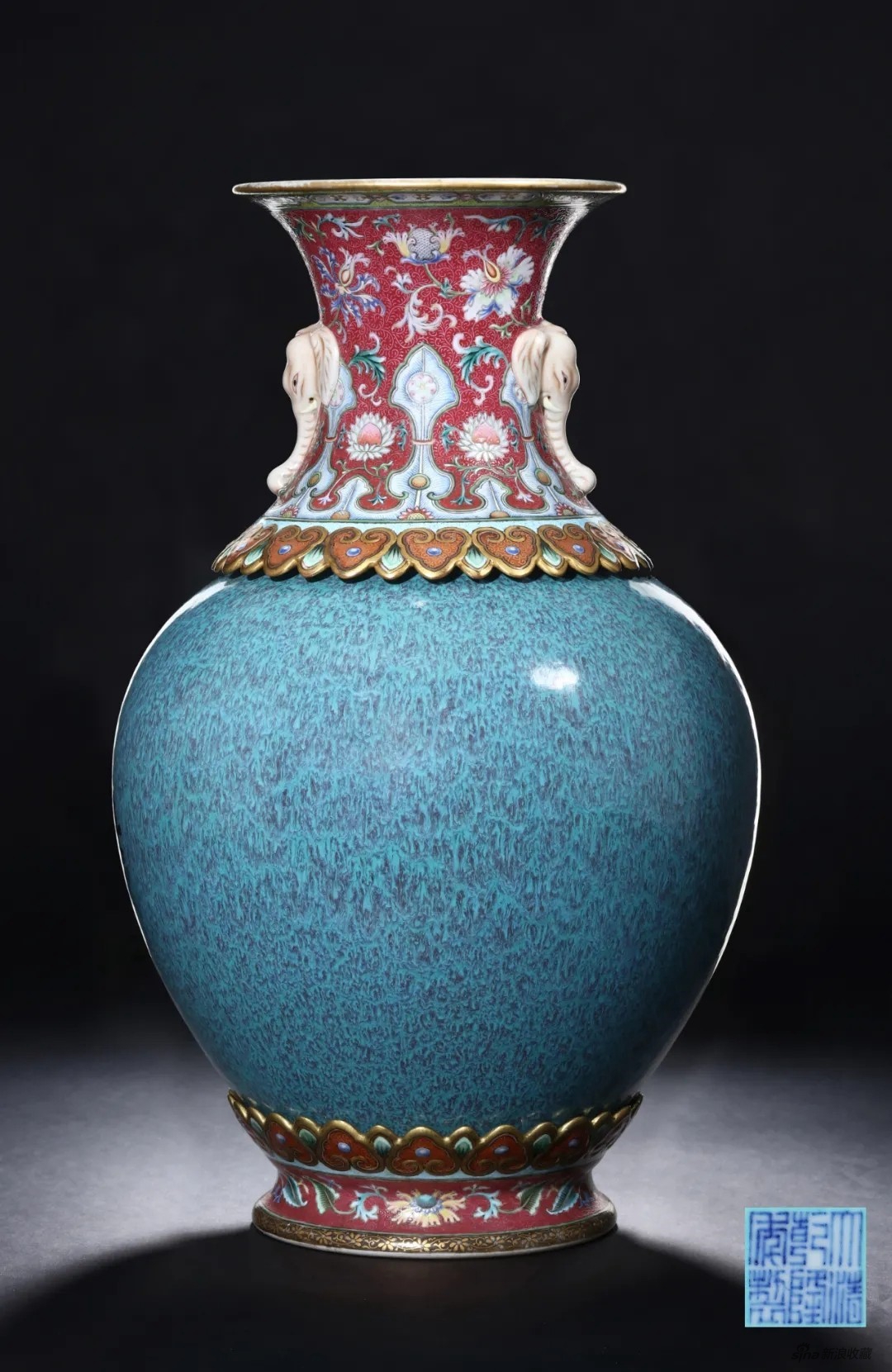 清乾隆御制胭脂红地番莲花卉套炉钧釉太平有象转心瓶工艺精巧,造型独特,融合中西方审美于一体。此瓶两侧收紧处饰有造型灵动的双象耳,象鼻轻垂,寓意“太平有象”。其足内松石绿地青花书“大清乾隆年制”六字三行篆书款,为乾隆八年至十年之间所特制。这种以单色釉相配的转心瓶,存世珍罕。