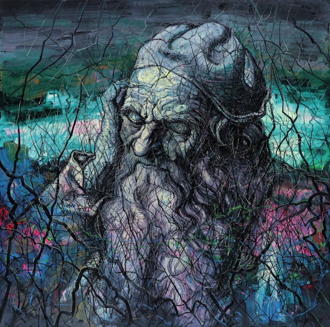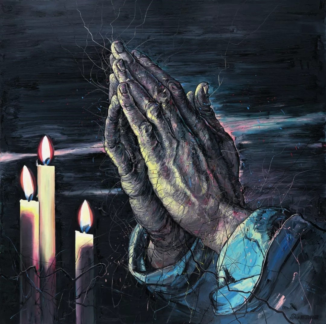 曾梵志创作生涯的里程碑之作《祈祷》、《智者》,“乱笔”系列是曾梵志在“面具”基础上自我突破的重要阶段,两件作品灵感均源自德国文艺复兴时期艺术大师阿尔布雷特•丢勒(Albrecht Dürer)的素描杰作。《智者》中,老人双眼紧闭,沉浸于冥想之中,漫天藤蔓暗示出人物内心复杂的思维与精神世界。《祈祷》则是超大画幅,令原始图像超越了宗教祈祷的表征意义,通过极具质感的厚涂颜料还生动地呈现出肉身衰老时的微妙变化。