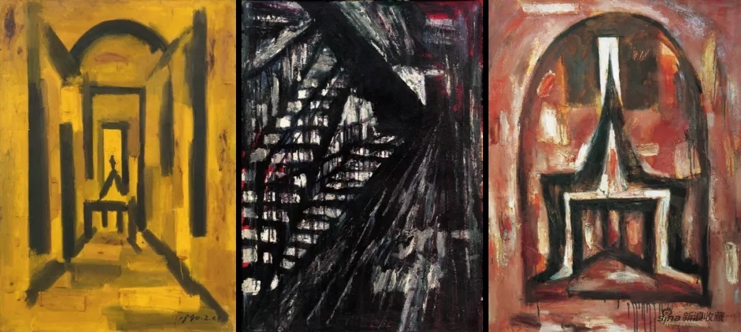 毛旭辉 《黄色调家长图》;《深夜的走廊和楼梯》;《有拱门的红土调家长图》(一组3件)