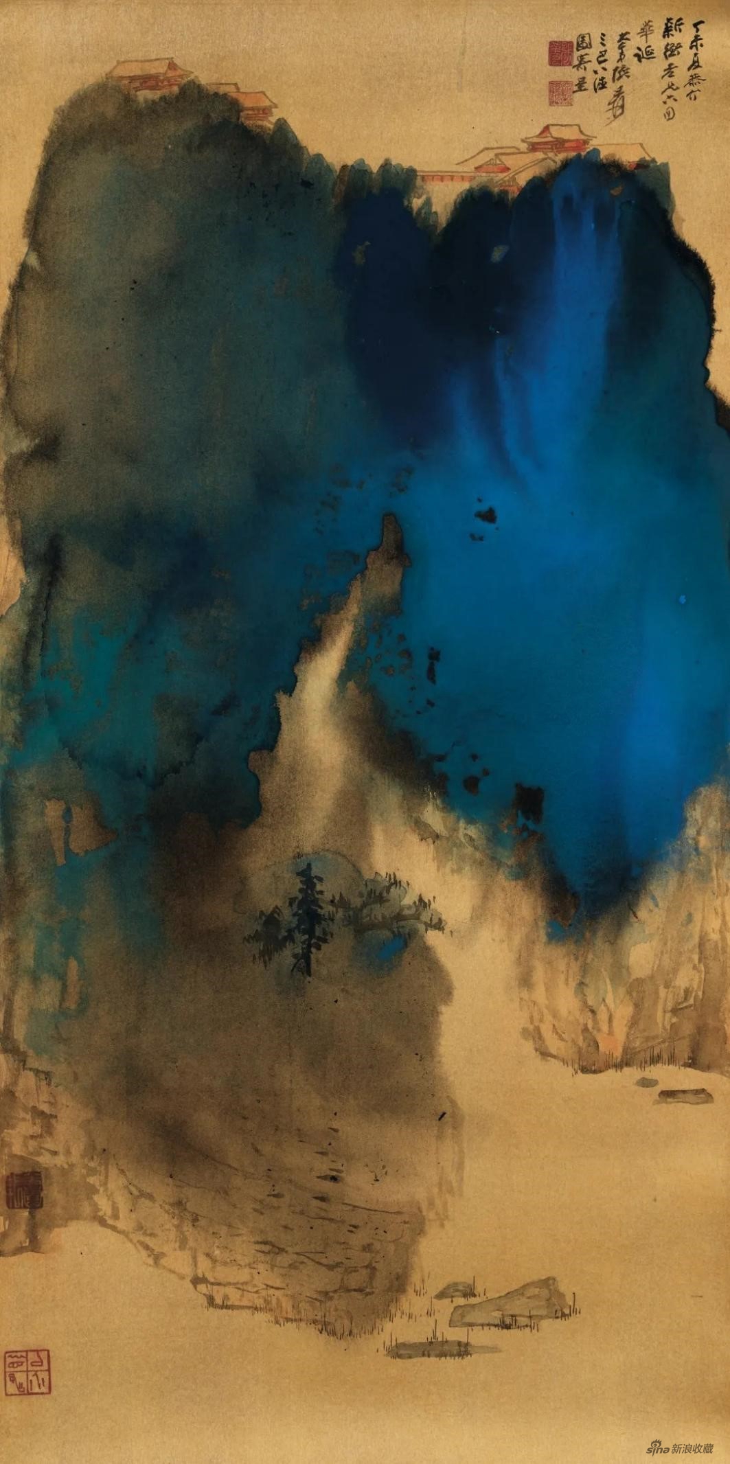 《丁未泼彩》是张大千晚年为好友庆祝六十华诞的贺礼。张大千大笔挥毫泼墨之下粗中有细,对于山石的肌理处理,树木的造型,山间的溪流无不灵动充满了生气。