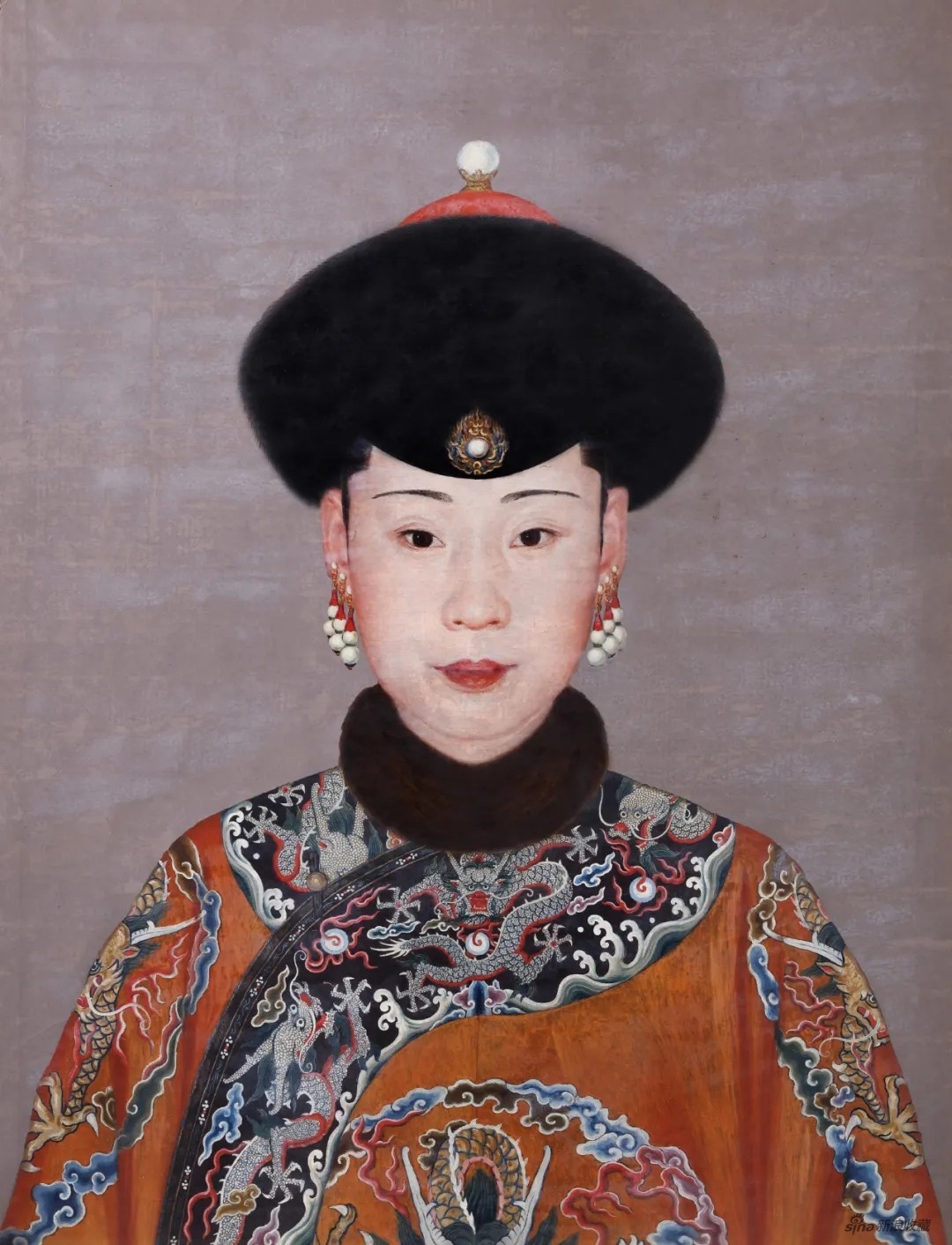 乾隆初年宫廷画家郎世宁创作的《纯惠皇贵妃油画像》经过了近三个世纪的流传,现身保利拍场。这件画像创作之时正值纯惠皇贵妃23岁,画像中年轻的皇贵妃身着金黄色缉米珠八团龙冬吉服袍,头戴东珠顶吉服冠,帽顶硕大东珠,青绒点翠嵌东珠火焰纹金饰眉勒子。